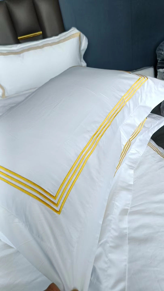 Descubre nuestras fundas nórdicas de plumón 100% algodón egipcio satén de 400 hilos: frescas, ligeras y excepcionalmente suaves. Diseñadas para ofrecer una experiencia de descanso superior, combinan elegancia atemporal con máxima comodidad. Su acabado blanco, realzado con bordados en dorado y gris brillante, aporta un toque sofisticado que se adapta a cualquier estilo de habitación.