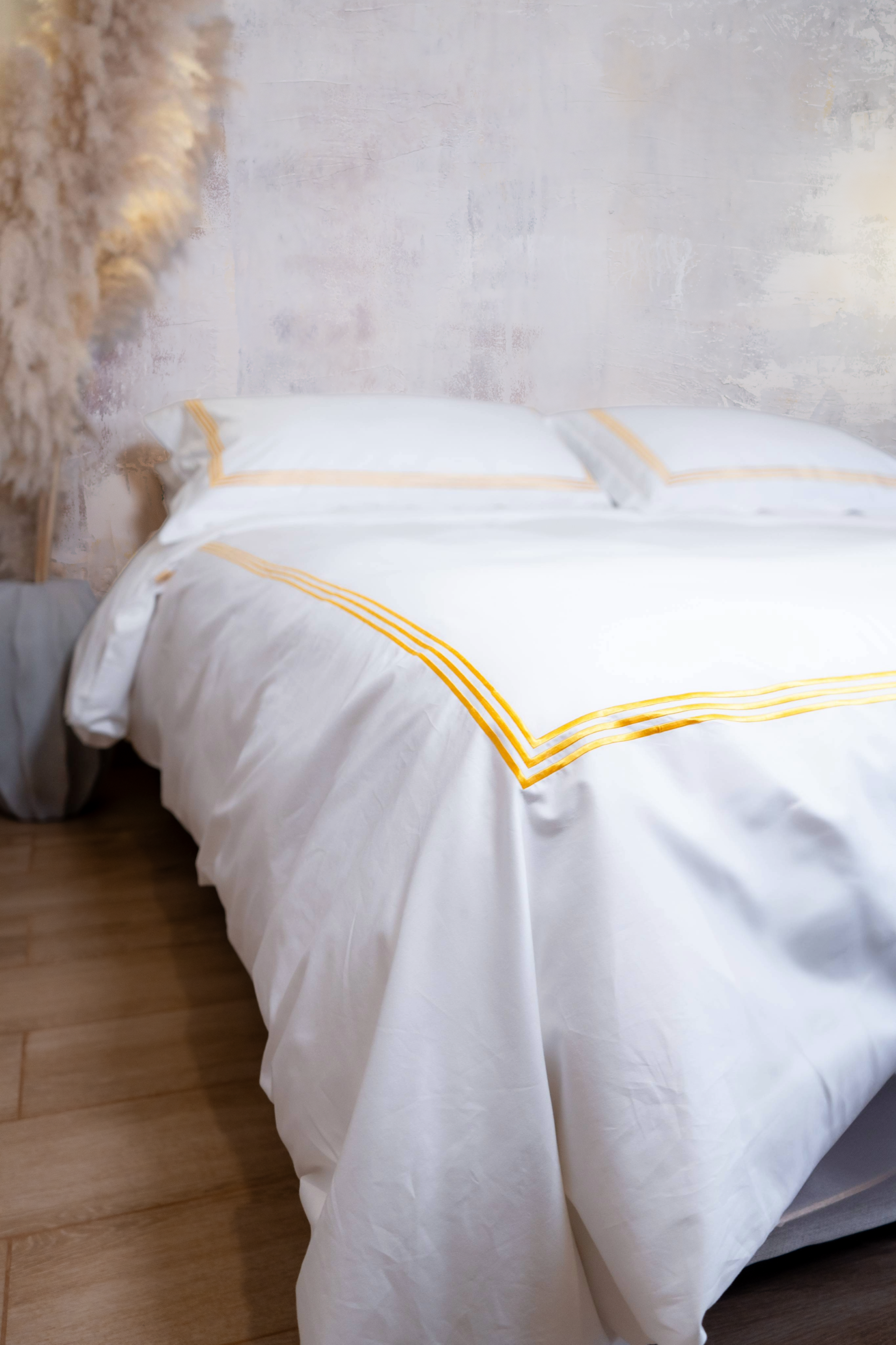 Funda nórdica de plumón de algodón egipcio 400 hilos en pigmento satén mercerizado y sanforizado: suavidad ligera, acabado premium en blanco con bordados oro y gris.