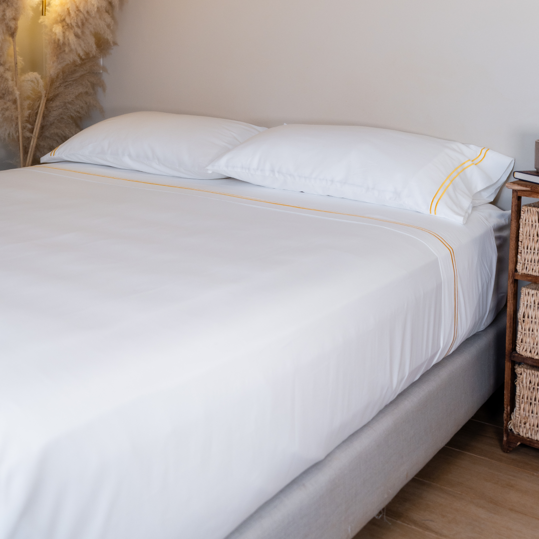 Nuestras sábanas de 600 hilos, confeccionadas con 100% algodón egipcio en pigmento satén, combinan suavidad sedosa, resistencia excepcional y elegancia atemporal. Cada fibra ha sido seleccionada para ofrecer una experiencia de descanso superior: fresca, envolvente y profundamente reparadora.